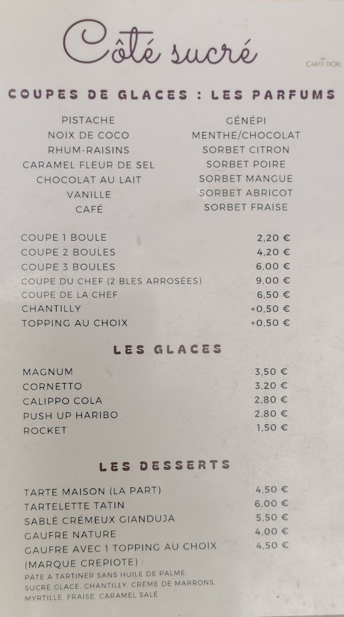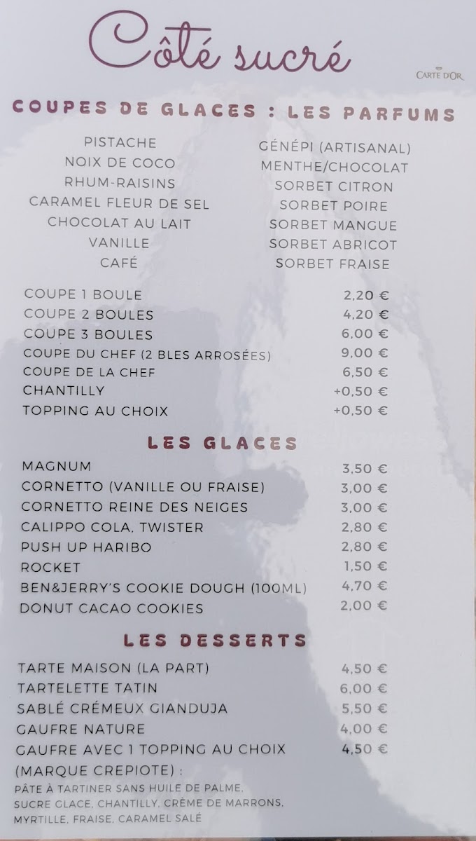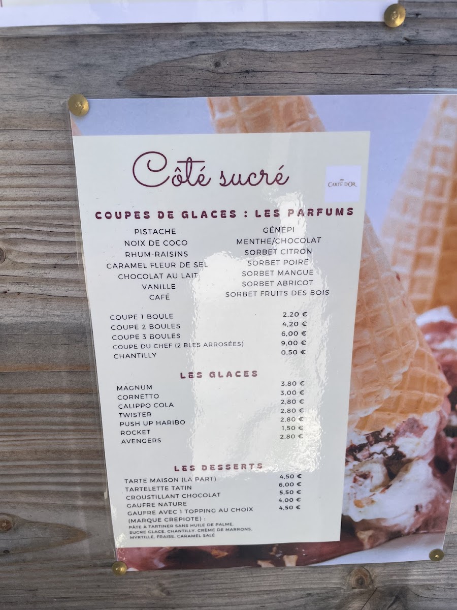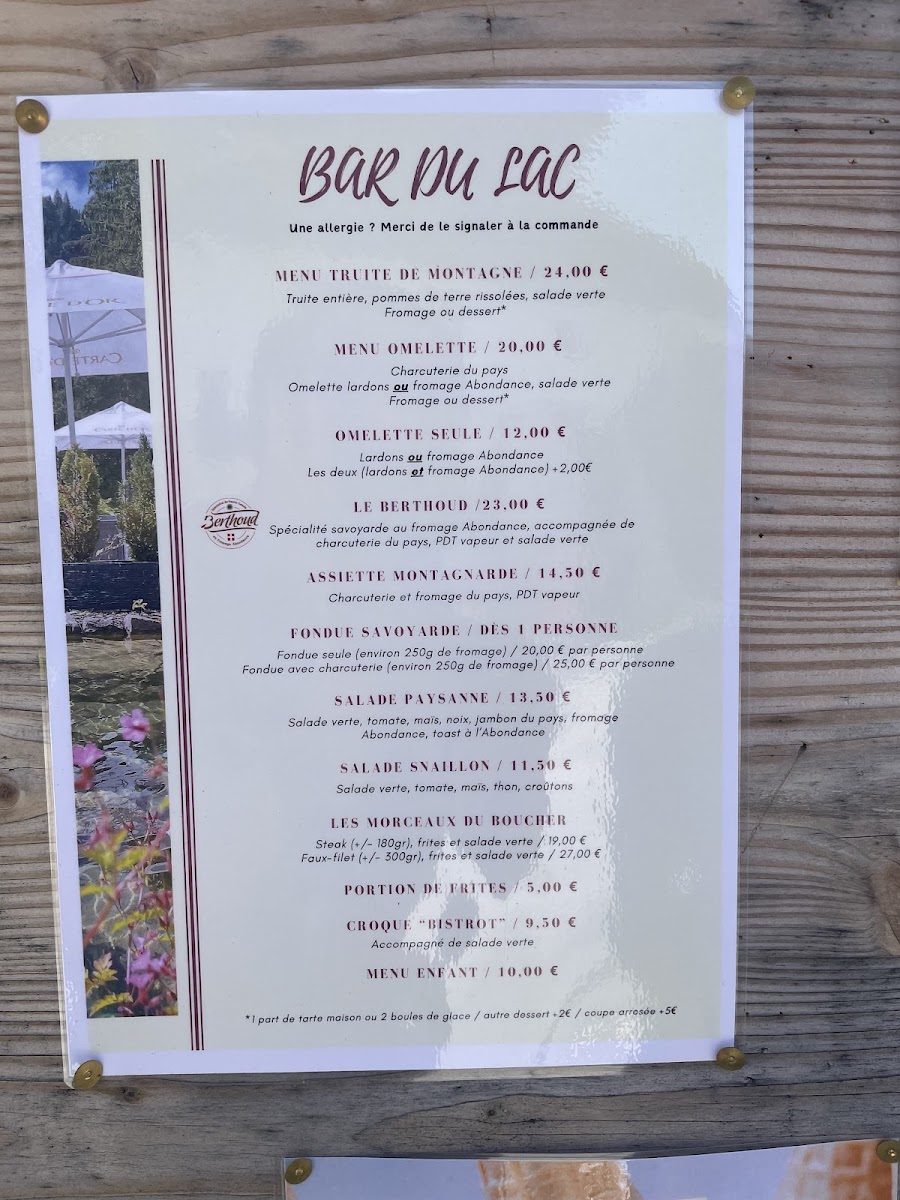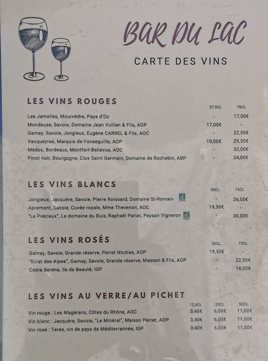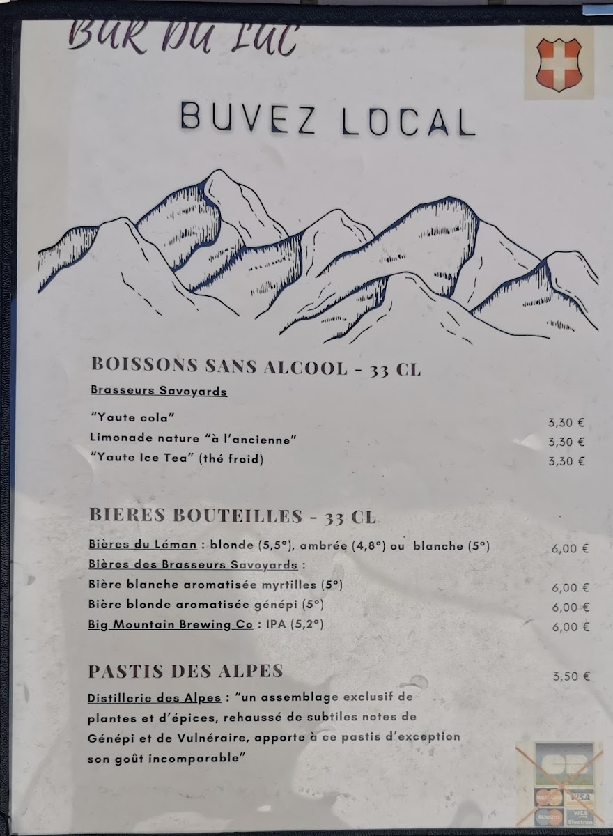 The drink menu at Bar Du Lac 'chez Remy' is just as appealing, with refreshing options such as Cidre Rosé, a crisp and fruity rosé cider, and Bière Léman Blanche, a light and smooth white beer. For something with a bit more local character, the Bière Au Genepi is a distinctive beer with a unique herbal flavor, offering a taste of the alpine region's signature herb, Genepi.