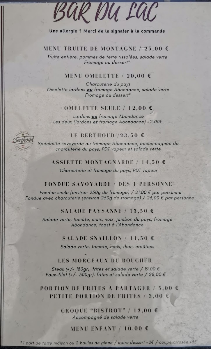 The menu at Bar Du Lac 'chez Remy' in Abondance, France offers a delightful array of local specialties that reflect the charm and flavors of the region. Among the standout dishes is the Tarte Aux Myrtilles, a delicious blueberry tart that perfectly balances sweetness with a touch of tartness. For those looking to try a true local dish, the Berthoud Local Specialty with Abandon Cheese and Ham is a must-try, showcasing the rich and creamy textures of Abandon cheese paired with savory ham. To accompany this, the Accompagnement Du Berthoud provides a wonderful side dish that enhances the flavors of the main course.